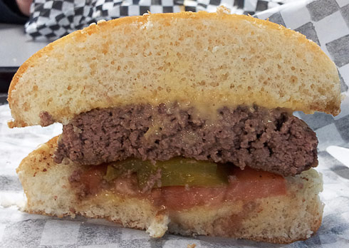 The sesame seed bun was a disaster.  Big, bready, and stale, it was dense and overwhelming and completely threw off the beef-to-bun ratio.  It had been placed on the griddle, though if I hadn’t seen it I wouldn’t have believed it — it was completely untoasted and cold (and if your griddle can’t even toast a bun, then you know it’s not hot enough).  The bun was also far too wide for the burger, which meant I ran out of burger long before I ran out of bun.