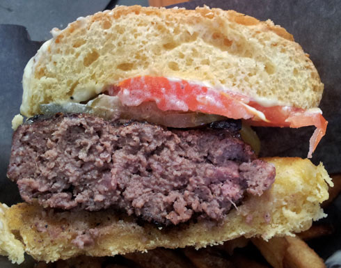 The fresh, sesame seed bun complimented the burger quite well, though it was far too big for the patty, leaving a wide ring of bread overhang. It’s pretty clear that they shape their patties to the size of the bun, without bothering to compensate for the shrinkage that occurs while cooking.