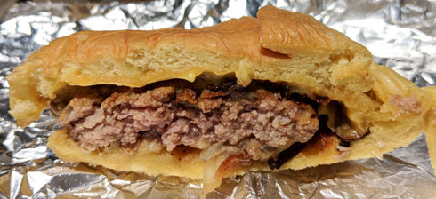 The bun was probably the weakest part. That’s a shame, because the soft beef-and-onion infused bun is a big part of the appeal of this style of hamburger. I’m pretty sure that it started out as a good-quality bun, but it had been so thoroughly mashed down and squashed into oblivion that all of the fluffiness had been compressed right out of it. It had the approximate texture of a really dense marshmallow. It wasn’t completely unappealing, but it was firm and chewy in a way that was odd and off-putting.