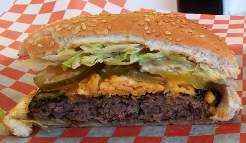 Aside from the prodigious spicing, the grilled burger is cooked to well done but not overcooked, and it’s actually reasonably juicy. The bun is a bit too bready, but basically fine, and the toppings are okay (though the pickles are sliced a bit too thick). Like I said, as a meatloaf sandwich it’s not horrible, but as a hamburger it’s almost hilariously misguided.